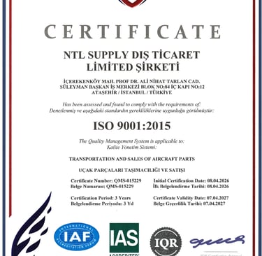 NTL Supply, kalite ve sektör standartlarına bağlılığını gösteren ISO 9001:2015 Sertifikasına sahip olmaktan gurur duymaktadır:. ISO 9001, kalite yönetimi için dünya çapında tanınan bir standarttır.